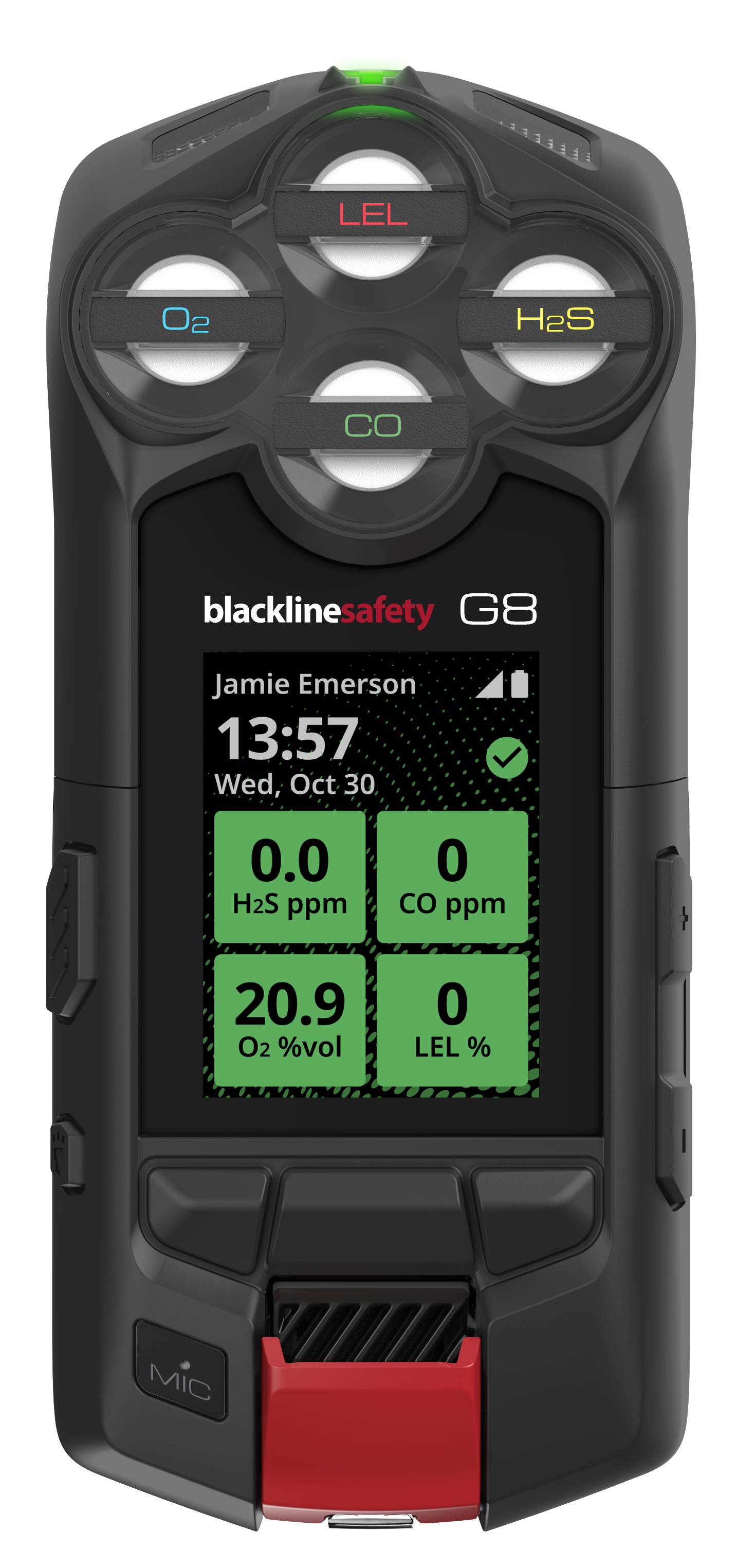 20 °C (68 °F), LEL-IR, H2S, CO e configuração de O2.